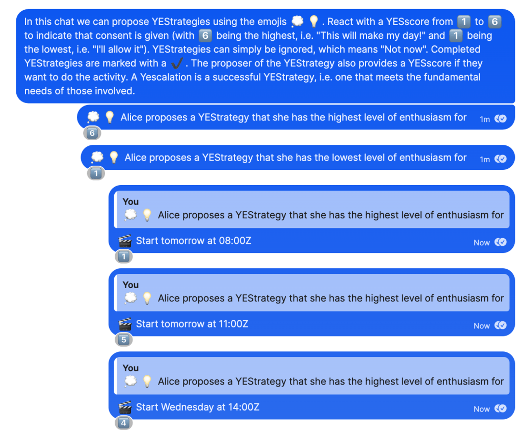 - Each YEStrategy is proposed in a separate chat message. This is so that it is possible to ‘react’ to each one with a separate YESscore.